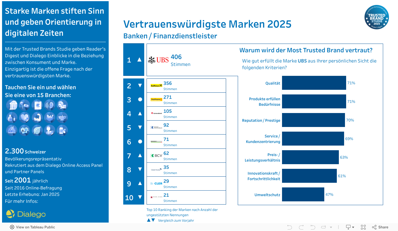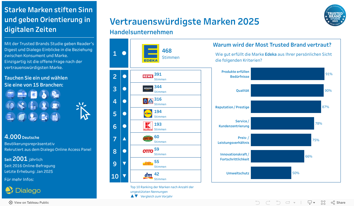 Gemeinsam mit Reader's Digest ermitteln wir seit vielen Jahren die vertrauenswürdigsten Marken der Deutschen und Schweizer in verschiedenen Branchen. Das Besondere in einer der größten Markenstudien in Deutschland und der Schweiz ist: Wir stellen die Frage nach den vertrauenswürdigsten Marken offen – es gibt keinerlei Vorgaben aus denen der oder die Befragte wählen müsste. Den Überblick in die Gewinner und Top 10 der vertrauenswürdigsten Marken 2025 aller 15 Branchen in Deutschland und der Schweiz kannst du direkt kostenlos im interaktiven Dashboard einsehen.